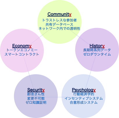 5つの観点とは、コミュニティ、エコノミー、セキュリティー、ヒストリー、サイコロジーである。英語表記の場合すべて’y”で終わることから、hashPeakでは5yと呼ぶ。